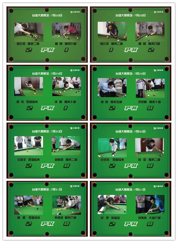 江西华邦第六届台球大赛于2014年7月28日开展场对决。本次大赛名额共30人, 30位选手抽签决定比赛号码及对手。PK角逐后15位优胜者与往年台球***刘总共16人,进行分组PK ,依次产生前8强,4强,季军,亚军以及***。